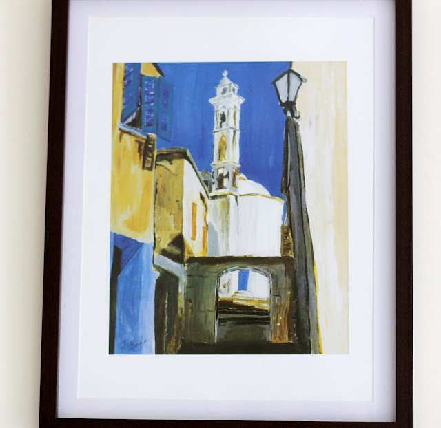 One afternoon whilst at the Episkopi sailing club, on Tunnel beach, we 'stumbled across' two of our old Teachers. And by old, I mean that they had taught us as youngsters, not that they appeared or seemed old at all, because they did not. I used to frequently babysit their kids as a teen, and I can still picture the inside of their house, including details. Their daughter was my youngest sisters best friend and she was often at our house, back then. A sweet natured, sunny, delight of a girl with freckles and vibrant red curls, and her younger cheeky brother, Sam. Sarah and Charles Beale were standing there in the sailing club, sharing a drink with friends - just as we'd left them years ago, it didn't seem real. They were the same people I had known, but different. Far more chilled out and with more of a hippy artistic vibe then I had remembered. I think though, that they had always been that way, I just hadn't really seen it back then. Now we were all adults, all on the same page and details that I had overlooked before, seemed so much clearer. We soon all got talking and a few days later, we found ourselves at their house for more catching up. No more married quarter for them, they were in a gorgeous, little gem of a house, nestled in the middle of a typical Cypriot village - it really seemed like a little piece of rustic heaven to me. And hung on their walls were the most beautiful, vivid, striking pieces of artwork. Some done by Sarah, some by Jessica who has inherited her Mums fantastic eye and talent. Even better then that, most of them were of our beloved Island, our home and we were lucky enough to take a few of Jessicas prints away with us. They've travelled around the world with us a few times, lovingly boxed and un-boxed. I'm so glad that they are finally in a place where we can see them. They inspire us to keep dreaming our dream, the one that will eventually find us back home again.